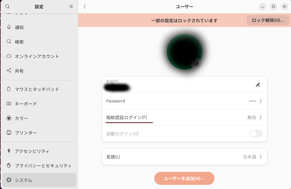 Ubuntuの設定 ==> システム ==> ユーザー とたどって項目を見てみると、